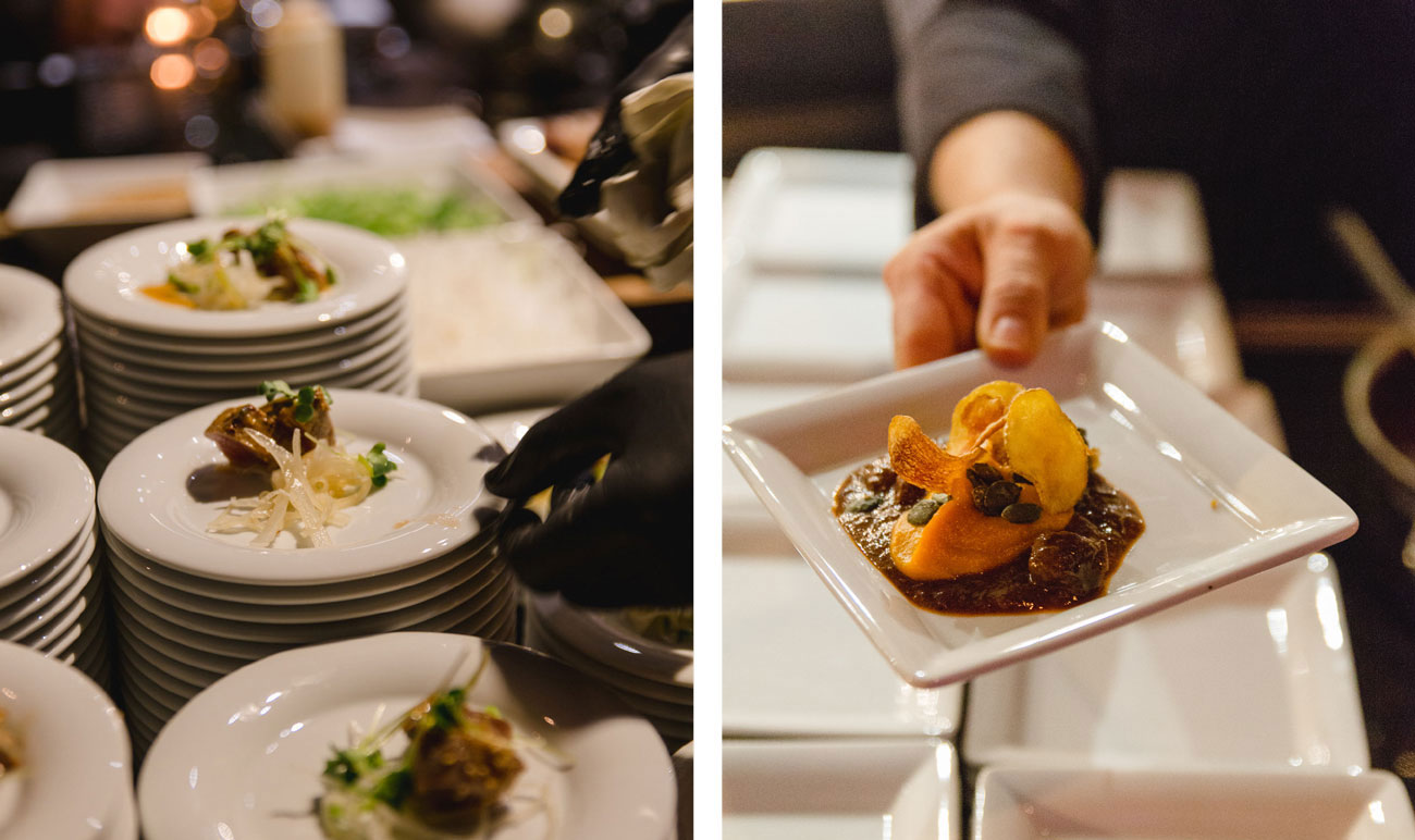 Die Reihenfolge, in der man die angebotenen Gerichte probieren konnte, hat sich jeder ganz individuell ausgesucht. War es an einer Kochstation mal ein wenig voller, ging man einfach zur nächsten und kam zu einem späteren Zeitpunkt wieder zurück. Die Portionen waren in perfekten Mengen angerichtet, so dass man auch wirklich alle 12 Speisen schaffen konnte. Und es blieb genug Platz um bei den verschiedenen internationalen Desserts und Schokoladen noch einmal beherzt zuzugreifen.