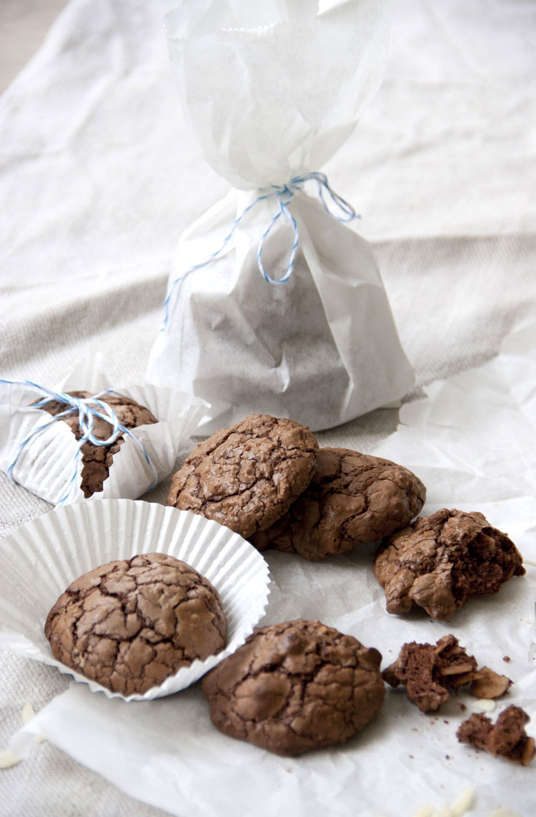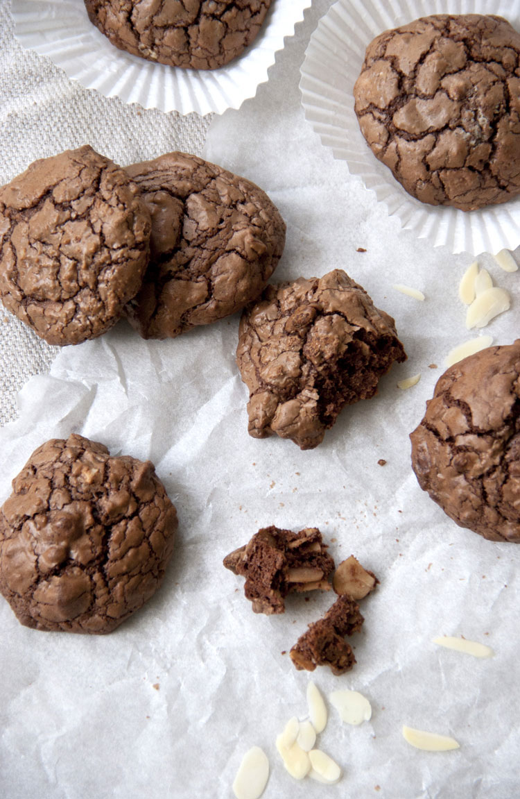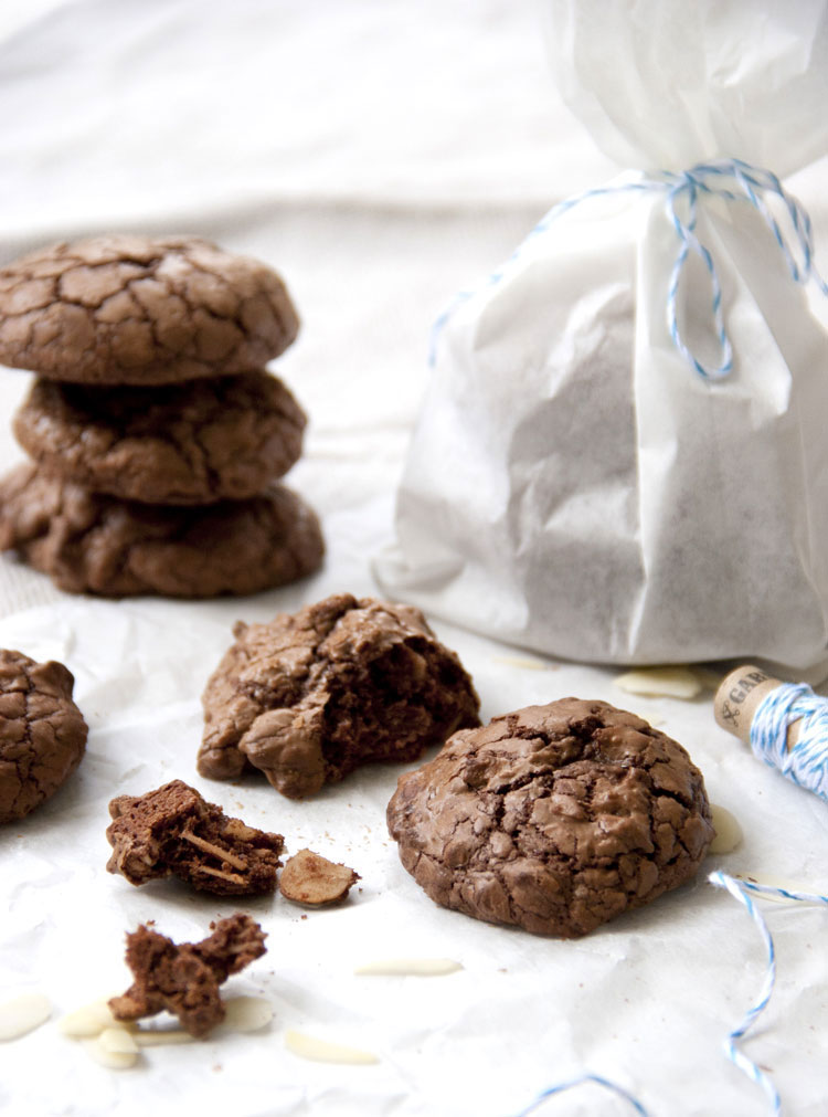 Die Kuvertüre fein hacken und zusammen mit der Butter im Wasserbad schmelzen. Die Eier mit Zucker, Vanillezucker, Bittermandelaroma und Salz schaumig rühren und die weiche Schokomasse unterziehen. Mandeln, gehackte Schokolade und das mit Backpulver, Lebkuchengewürz und dem zerstoßenen Kardamon gemischte Mehl vorsichtig unter die Schaummasse ziehen, dabei nur so viel rühren, wie unbedingt nötig. Den Teig für 30 Minuten kalt stellen. Jeweils ca. 2 Teelöffel Teig mit großzügigem Abstand auf ein mit Backpapier ausgelegtes Blech setzen und die Cookies im vorgeheiztem Ofen bei 170°C 10 bis 12 Minuten backen. Den weihnachtlichen Duft genießen und sofort nach dem Abkühlen der Cookies darüber herfallen.