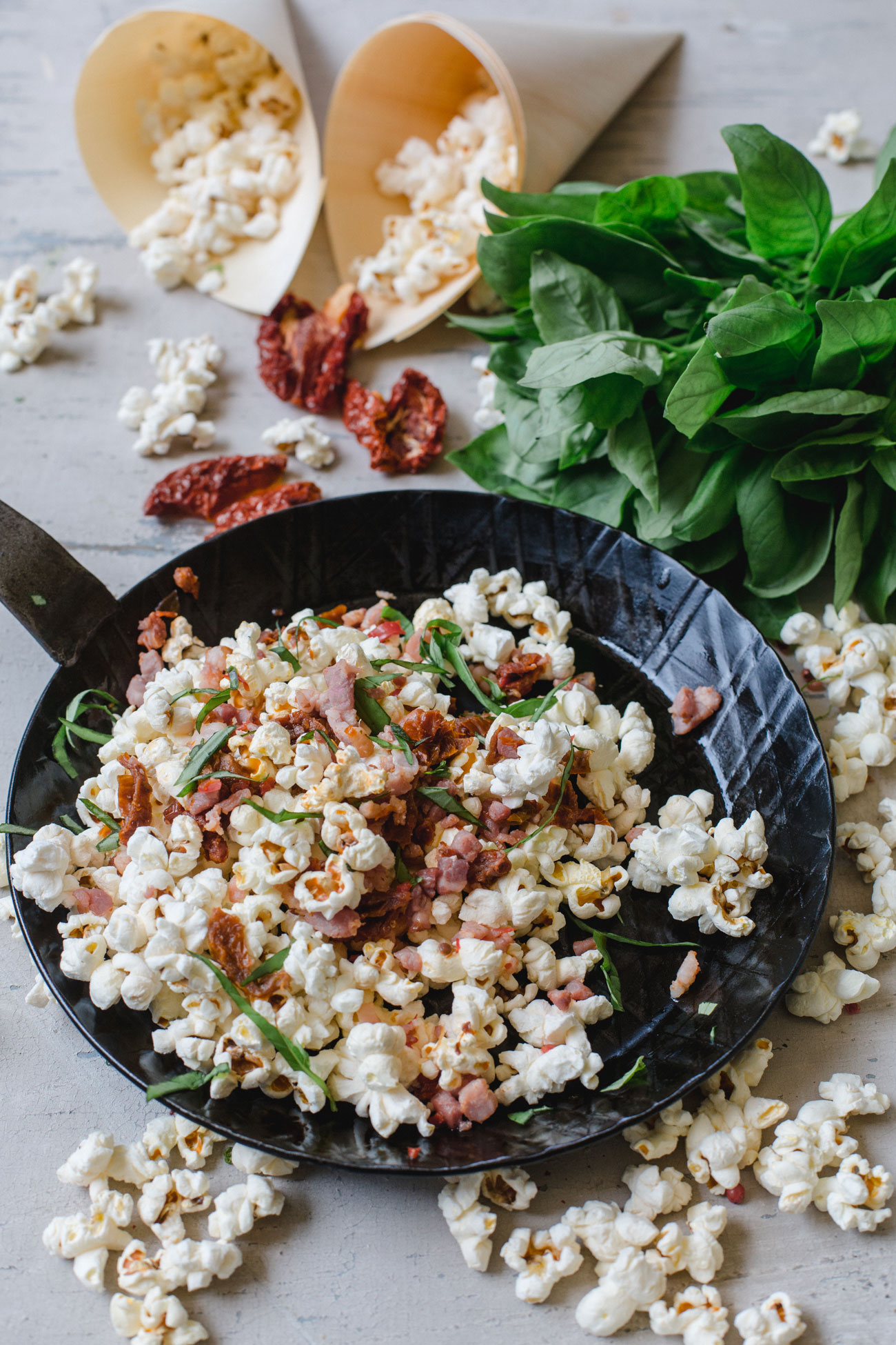 Popcorn mit Speck, getrockneten Tomaten und Basilikum