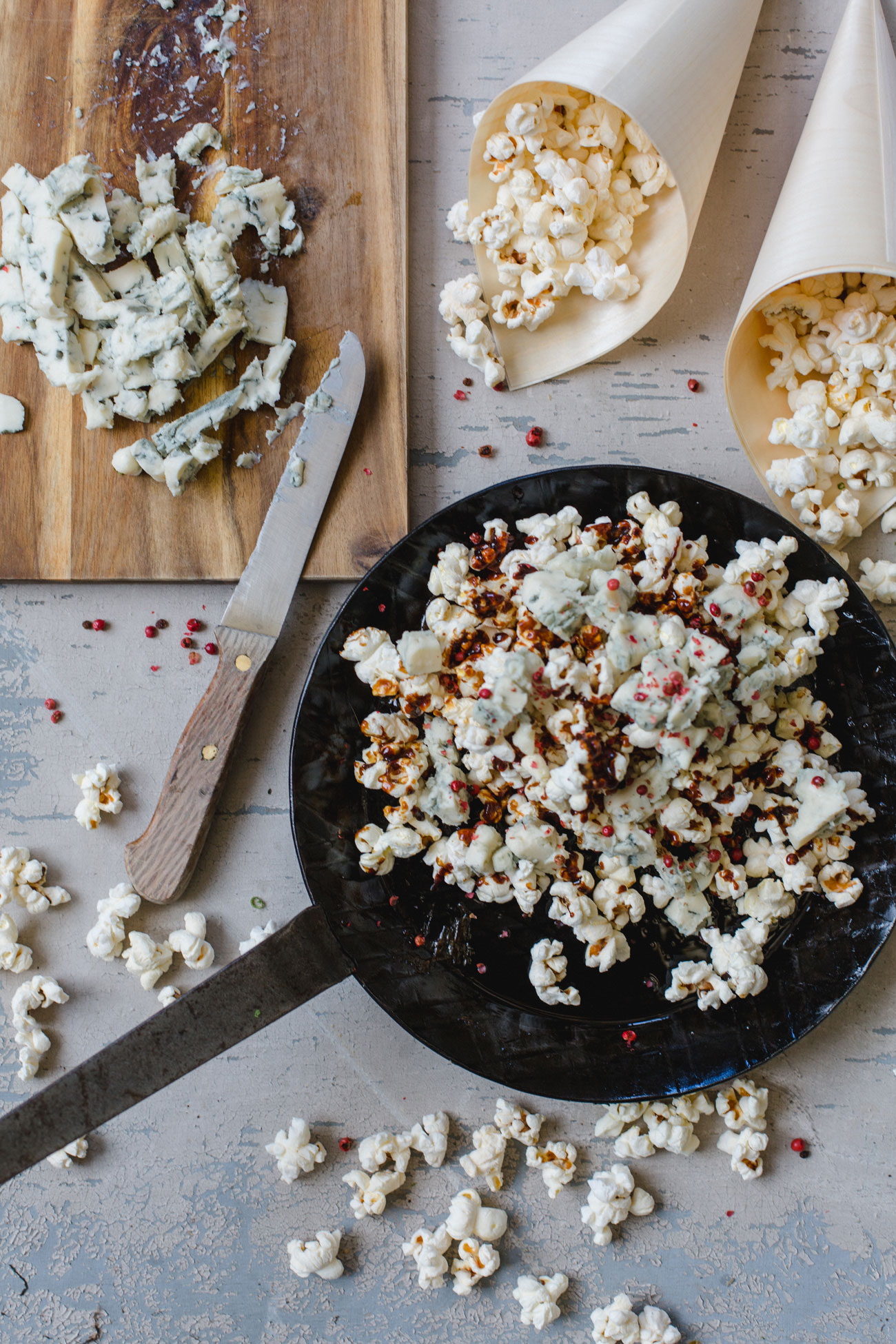 Popcorn mit Karamell, Gorgonzola und rotem Pfeffer
