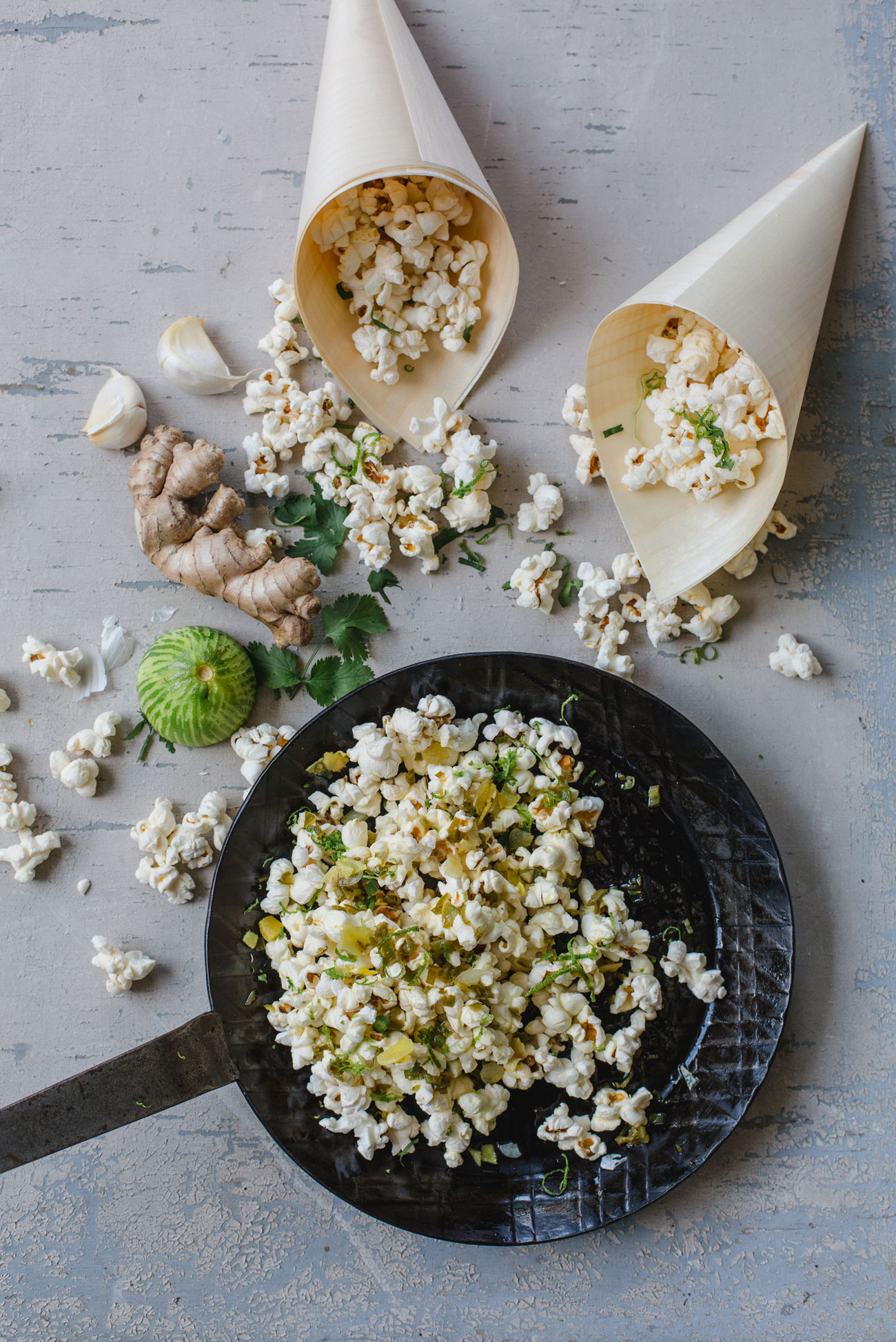 Popcorn mit grünem Chili, Ingwer, Knoblauch und Limette