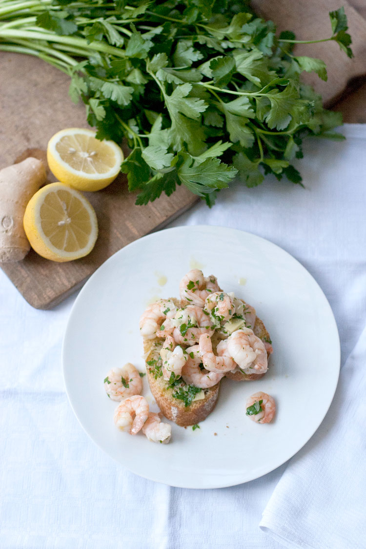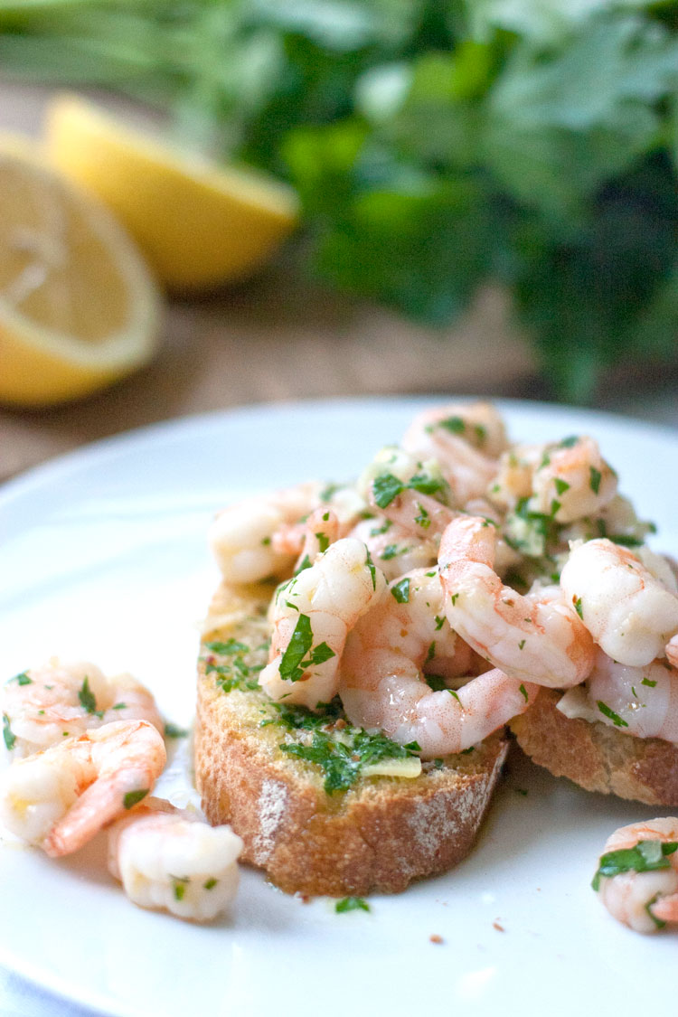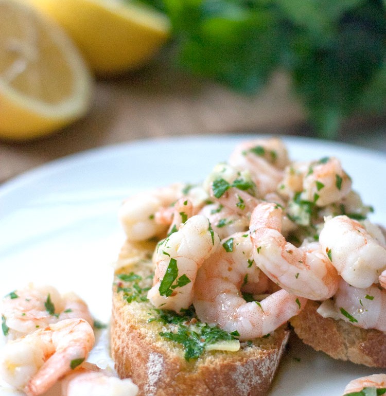 Die Temperatur reduzieren und den Saft von einer Zitrone darüber pressen. Die Petersilie und ein paar Spritzer Olivenöl dazu geben. Würzen, vermischen und vom Herd nehmen. Es sollte eine schöne, saftige Sauce entstanden sein. Kosten, ob vielleicht noch etwas Zitronensaft fehlt und entsprechend nachwürzen. Auf den getoasteten Ciabatta-Scheiben anrichten und dabei die köstlichen Sauce üppig darübergeben, damit sich das Brot richtig schön volldsaugen kann.