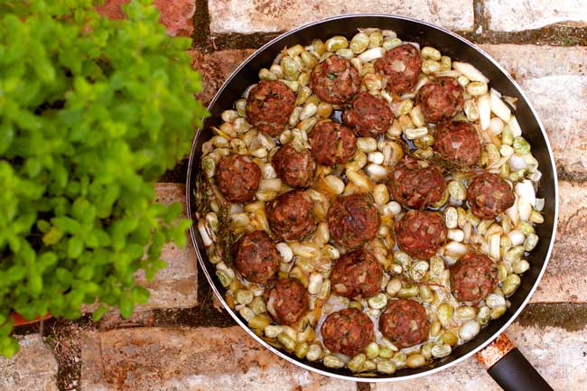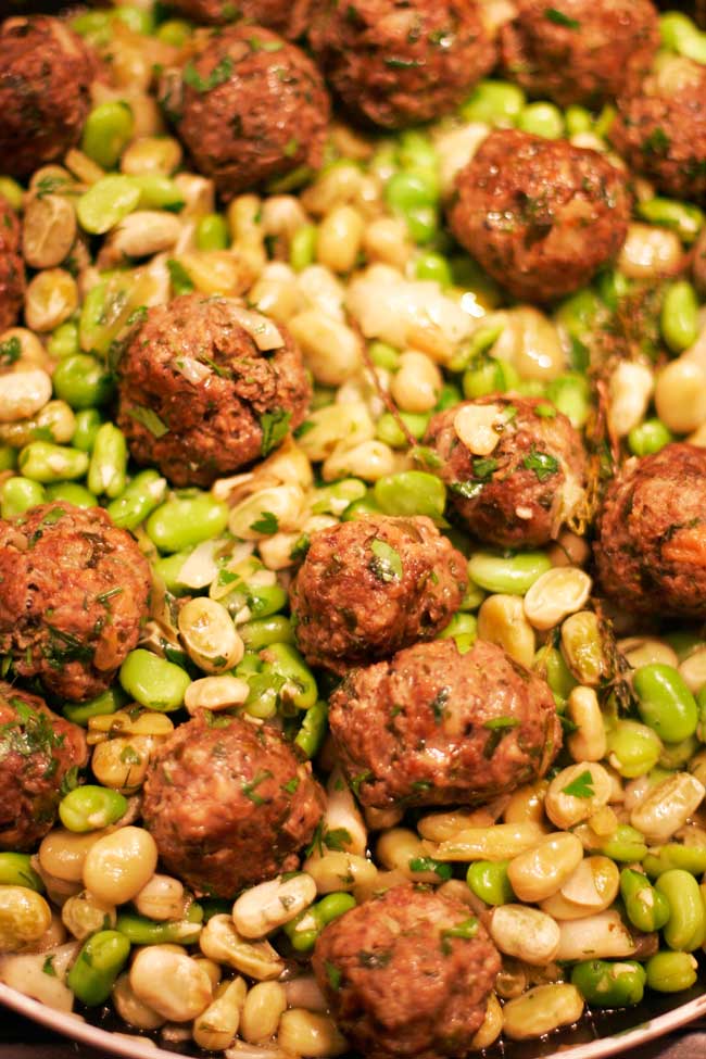 Die Fleischbällchen dazugeben, die restliche Brühe angießen und alles zugedeckt ca. 25 Minuten köcheln lassen. Die Sauce abschmecken und falls nötig noch einmal reduzieren. Die Fleischbällchen saugen sehr viel Flüssigkeit auf, deshalb darauf achten, dass nach dem Garen noch genug Flüssigeit in der Pfanne ist. Die gehackten Kräuter und den restlichen Zitronensaft unterrühren, die gehäuteten Bohnen hinzufügen, vorsichtig umrühren. Fertig zum Servieren.