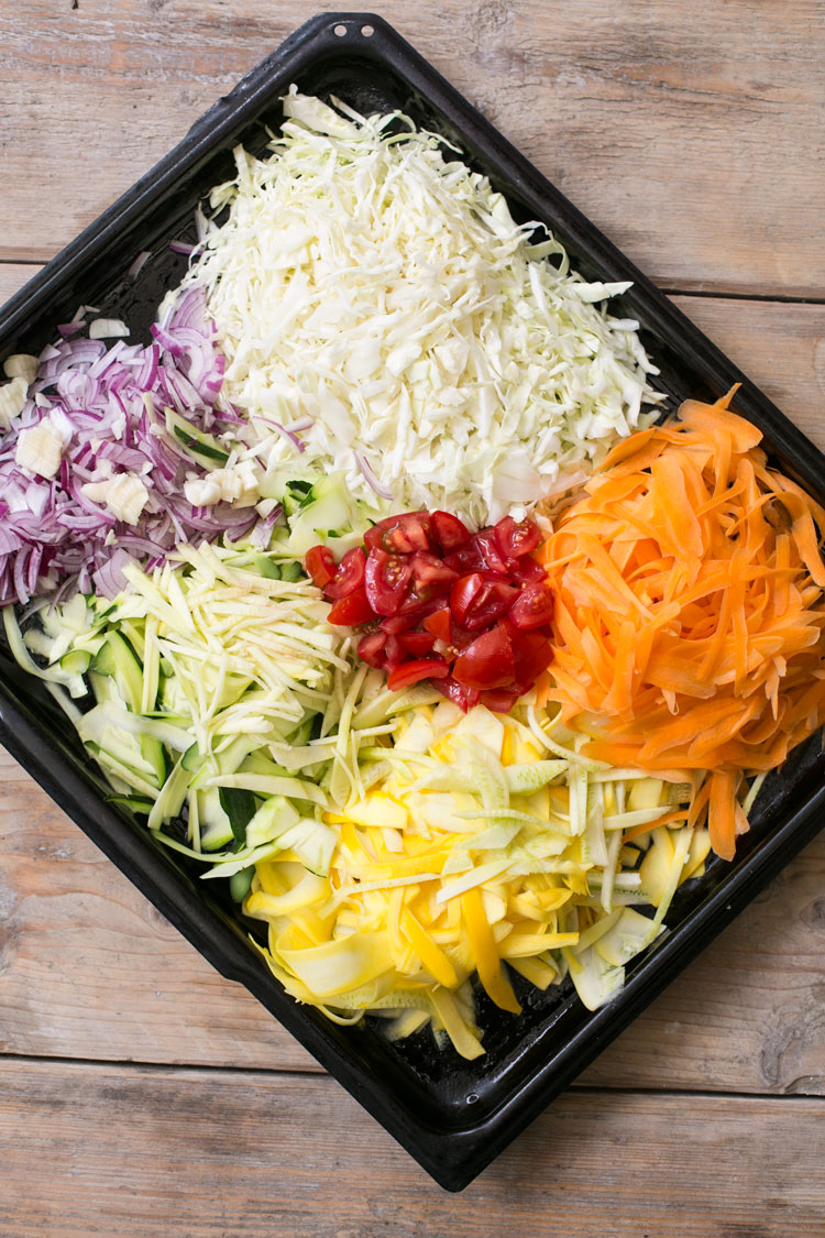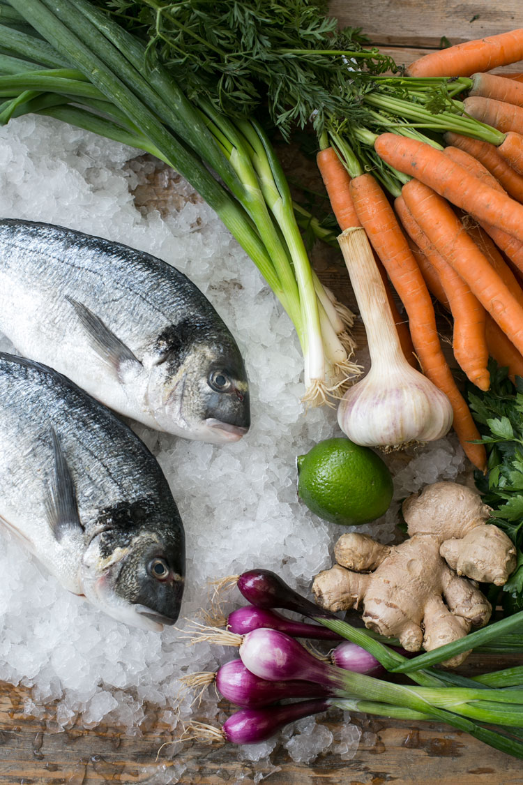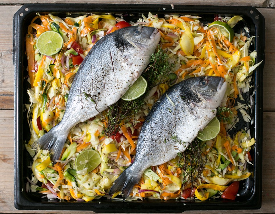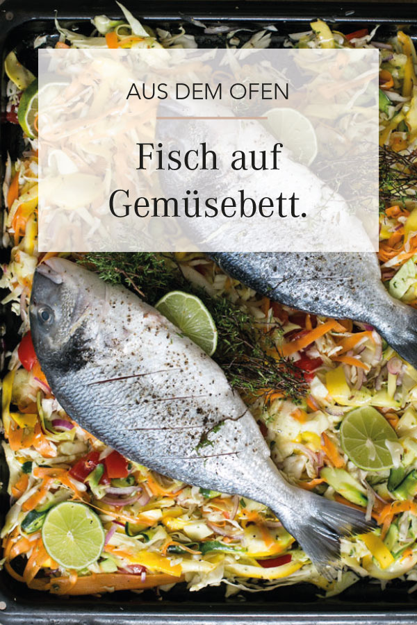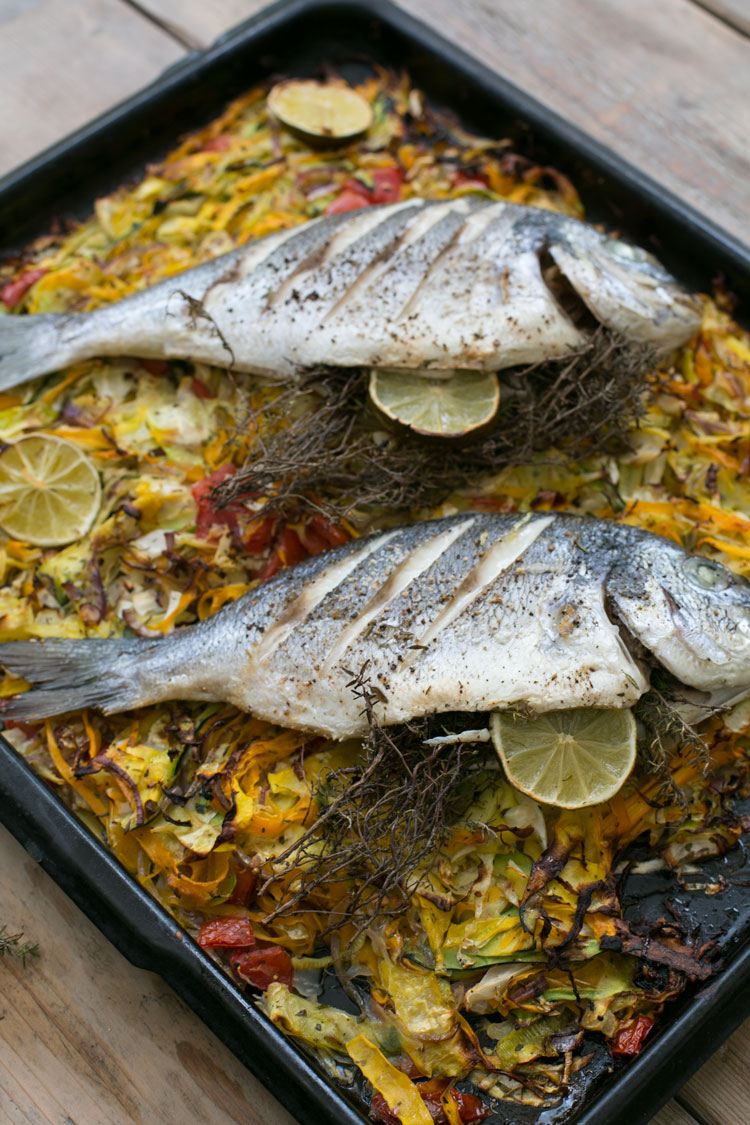 Den Ofen auf 160° vorheizen. Die Möhren und Zucchini mit dem Sparschäler, den Spitzkohl und die Zwiebeln mit dem Messer in feine Streifen schneiden. Tomaten und Knoblauch grob würfeln. Auf dem Blech verteilen, mit Salz, Pfeffer und einer Prise Chili kräftig würzen und großzügig Olivenöl darübergeben. Die Haut der Goldbrassen diagonal einschneiden. Innen und außen mit Salz und Pfeffer kräftig würzen. Mit frischem Thymian und Limettenscheiben füllen. Dann auf das Gemüsebett geben und für ca. 30 Minuten bei 160 Grad in den Ofen geben. Schon fertig. Also bis auf die feine Entgrätung.