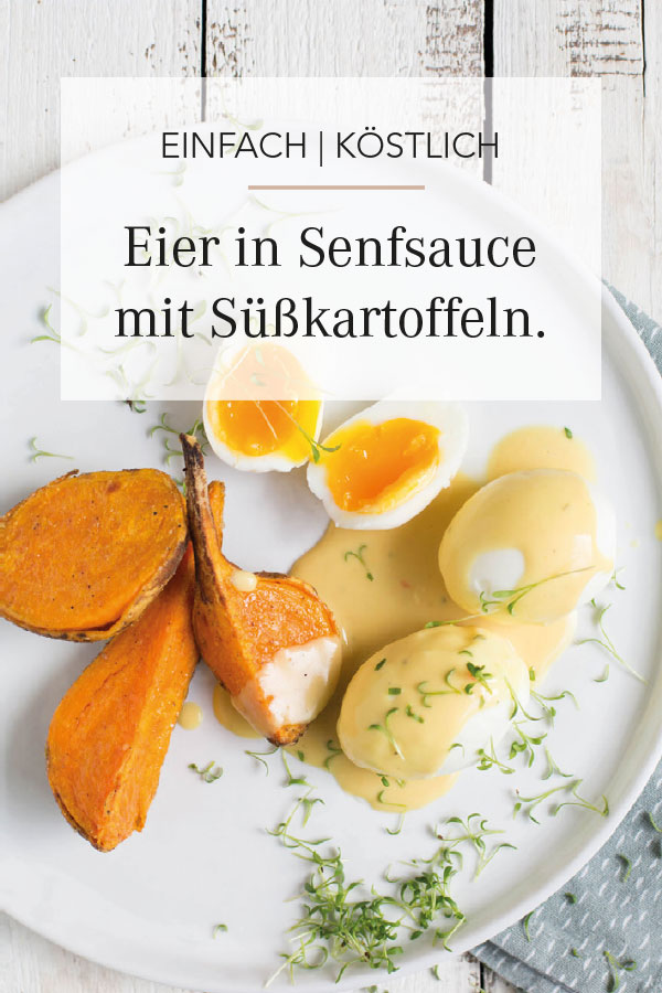 Die Eier längs halbieren, auf dem Teller anrichten und mit der Sauce servieren. Dazu die köstlichen Süßkartoffeln aus dem Ofen genießen.