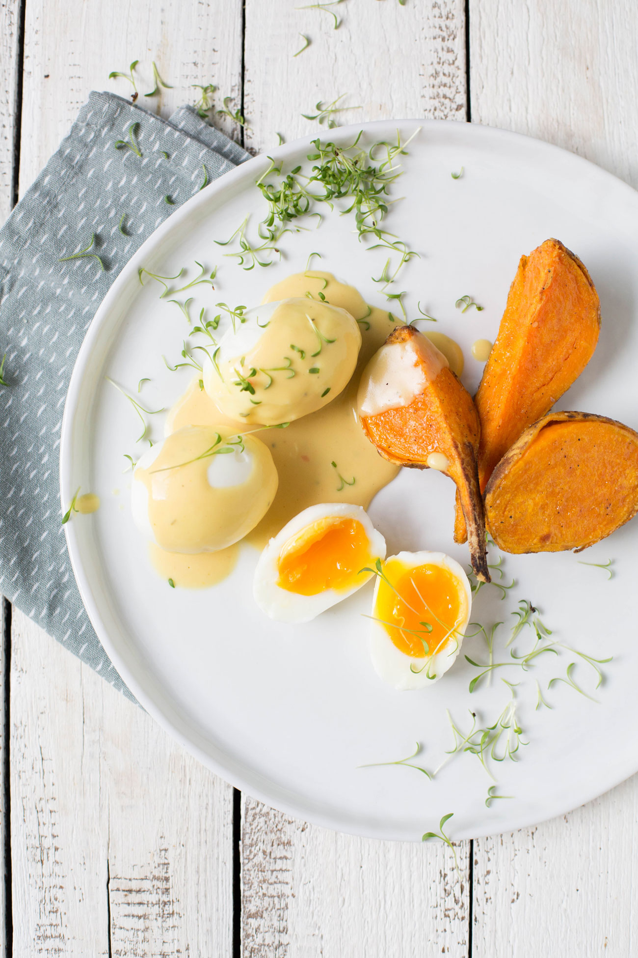 Ganz easy. Ich habe die hübschen Eier fotografiert, der Held hat die Eier gekocht, die Süßkartoffeln gebacken, die Soße angerührt und zack war alles fertig.