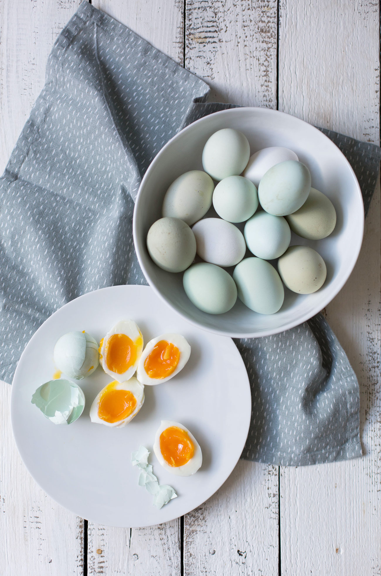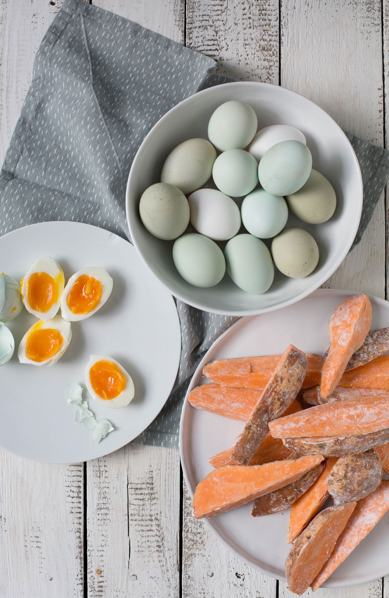Die Kombination der Eier mit Senfsauce zu den Süßkartoffeln ist übrigens ein Traum. Da siehst nicht nur so wunderschön aus, die Süßkartoffeln schmecken einfach auch soviel besser dazu als normale Kartoffeln. Unbedingt ausprobieren! Geht natürlich auch mit Eiern, die nicht so eine hübsche grüne Schale haben.