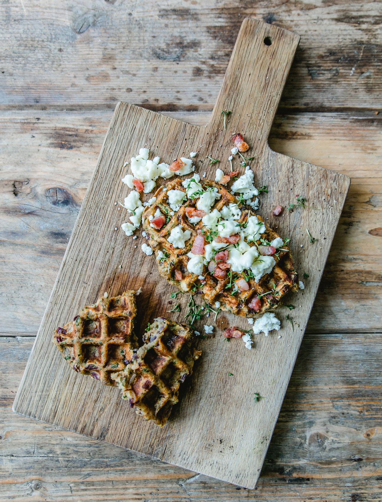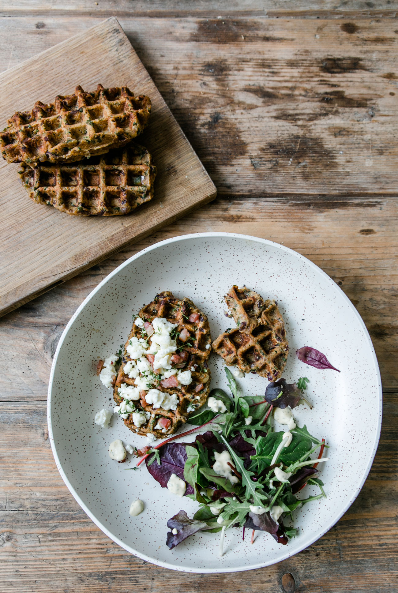 Das Waffeleisen aufheizen und mit Butter einfetten. Den Brotteig zu acht Kugeln formen. Die Kugeln im Waffeleisen portionsweise zu goldbraunen Waffeln ausbacken. Herausnehmen und auf einem Gitter auskühlen lassen. Wir haben noch  knusprige Speckwürfel dazu gegeben. Und Feta, für die, die ihn mögen. Und Salat. Selbstverständlich mit der besten Salatsoße ever. Die schmeckt den Kindern immer noch gut. Seit Jahren. 🙂