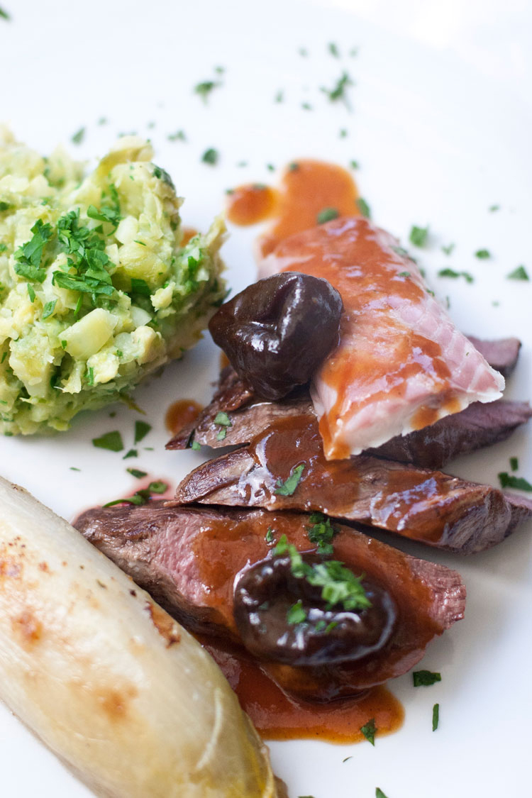 Hirschfilet mit Aal, Rosenkohlpüree und geschmortem Chicoree