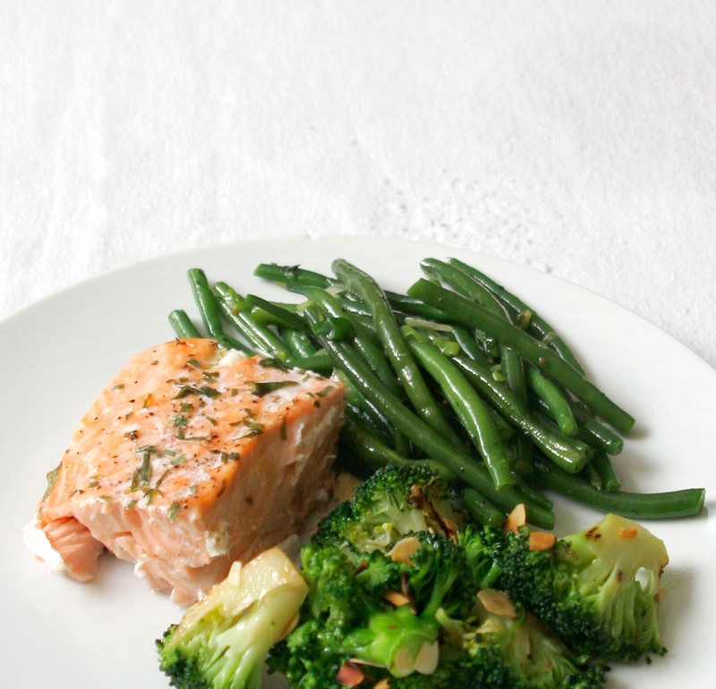 Lachsseite oder auch Lachsfilet in Stücke teilen und mit der Hautseite nach unten in eine geölte, feuerfeste Form geben. Den Lachs mit grobem Salz und Pfeffer aus der Mühle würzen. Wer mag, gibt noch etwas Estragon über den Fisch. Für ca. 25 Minuten in den Ofen geben, fertig.