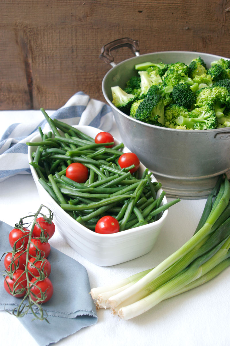 Die Bohnen sind auch blanchiert und mit Schalotten in der Pfanne geschwenkt und die Tomaten auf dem oberen Bild sind für den roten Farbklecks.
