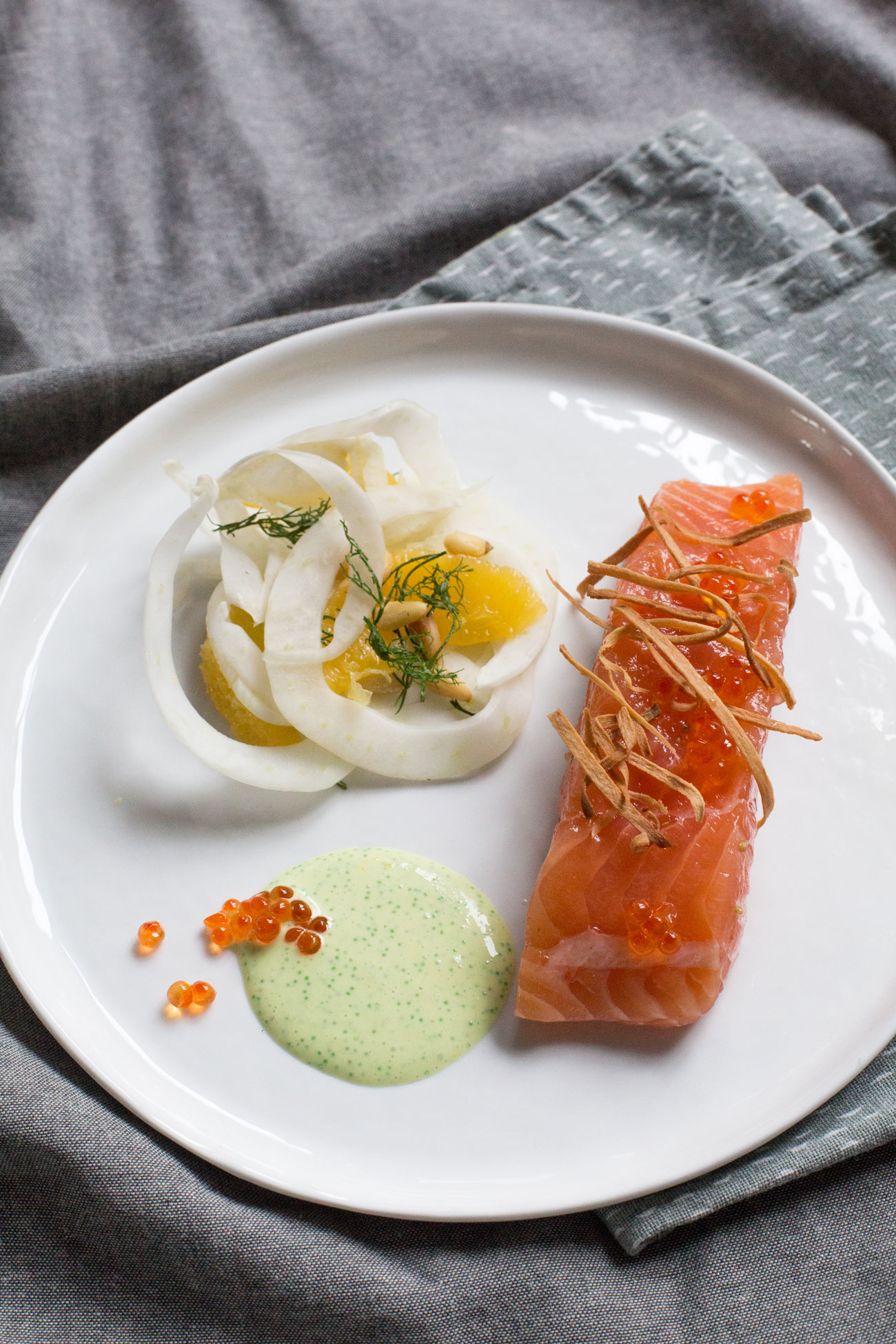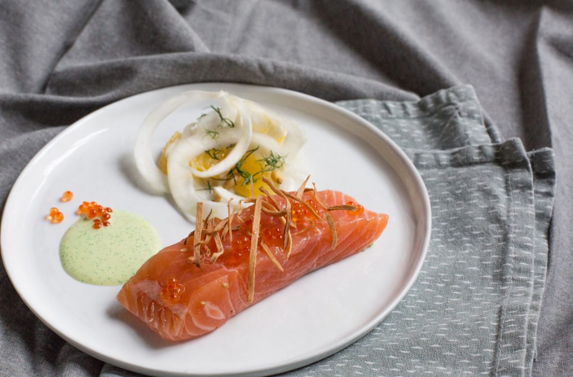 Marinierter Lachs mit Fenchel und Wasabi-Masago-Creme