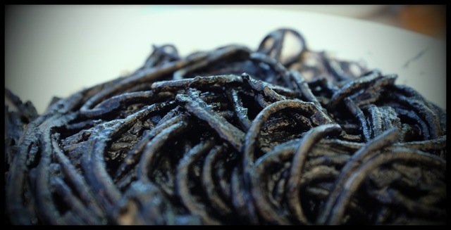 Tüchtig viele Zwiebeln anschmelzen (mehr ist mehr), mit Rotwein ablöschen und etwas einkochen lassen. Tomatensugo dazu. Gut und lange einkochen lassen, nach Belieben würzen (Salz, Pfeffer, Knoblauch, Oregano – aber vor allem auch Zucker!). Frische Tintenfischstückchen darin garen. Dann die Tomatensoße mit Tintenfischtinte richtig schwarz färben (die Tütchen gibt’s beim Fischhändler). Spaghetti dazu.