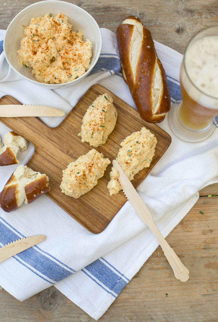 Camembert in Stücke schneiden, mit dem Frischkäse und der Butter mit einer Gabel zerdrücken und zu einer geschmeidigen Masse verrühren. Zwiebeln, Gewürze und Schnittlauch unterheben und mit zwei Löffeln zu Nockerl oder Kugeln formen. Laugenbrot passt herrlich dazu. Und natürlich ein ordentliches Weißbier. Prost.