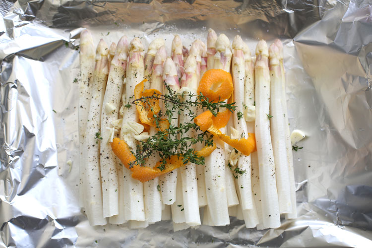Den Backofen auf 160° C Umluft vorheizen. Den Spargel sorgfältig schälen und die holzigen Enden abschneiden. Auf dem Backblech eine große (Grill-) Alufolie ausbreiten und den Spargel dort maximal zweifach aufgeschichtet hineinlegen. Großzügig mit Salz und Pfeffer sowie einer Prise Zucker würzen. Dann die mit einem Sparschäler abgelöste Haut der Orange, die Knoblauchzehe, sowie die Thymianzweige auf dem Spargel verteilen. Abschließend kleine Butterstücke darüber geben. Nun die Alufolie dicht verschließen, sodass keine Flüssigkeit entweichen kann. Verschlossene Alufolie auf dem Backblech auf der mittleren Schiene zwischen 25 bis 30 Minuten backen (je nach Spargeldicke).Der Spargel sollte bissfest sein.
