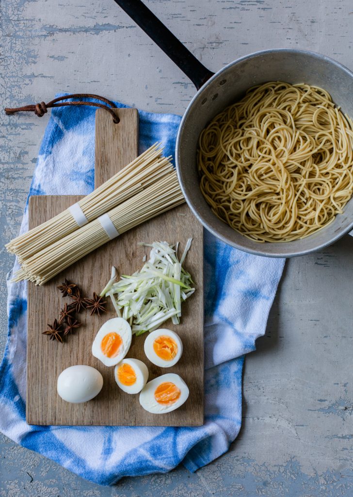 Für die Herstellung der Brühe die zerteilten Schweinebratenstücke nebeneinander in einen ausreichend großen schweren Topf legen. Den Lauch, Ingwer sowie alle anderen Zutaten dazugeben. Mit dem Wasser auffüllen und zum Kochen bringen. Bei niedriger Temperatur etwa 30 Minuten mit und weitere 30 Minuten ohne Deckel leicht köcheln lassen. Danach das Fleisch, den Ingwer und den Lauch aus der Brühe herausnehmen und beiseite legen. Die verbliebene Brühe bei hoher Temperatur um etwa die Hälfte reduzieren. Währenddessen die Eier unter Wasser abspülen und Schmutz von der Schale entfernen. Die Eier anstechen und in die kochende Brühe geben und ca. 8 Minuten mitkochen bis sie wachsweich sind. Dann abschrecken, die Eier pellen und vorsichtig halbieren. Sobald die Brühe reduziert ist, Temperatur abschalten und das Fleisch wieder in den Topf geben, ruhen lassen.