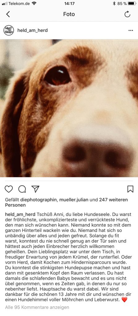 Außerdem mussten wir uns nach 13 Jahren von unserer treuen Anni verabschieden. Sie war eine ganz liebe Schoko-Labradordame, die wir im Alter von 8 Wochen bekamen und die uns so viele Jahre begleitet hat. Wir haben schon im letzten Jahr gemerkt, dass wir sie wohl nicht mehr so lange bei uns haben werden und konnten uns darauf vorbereiten. Als es dann aber wirklich so weit war, ist es uns allen noch viel schwerer gefallen, als wir uns das vorgestellt haben.