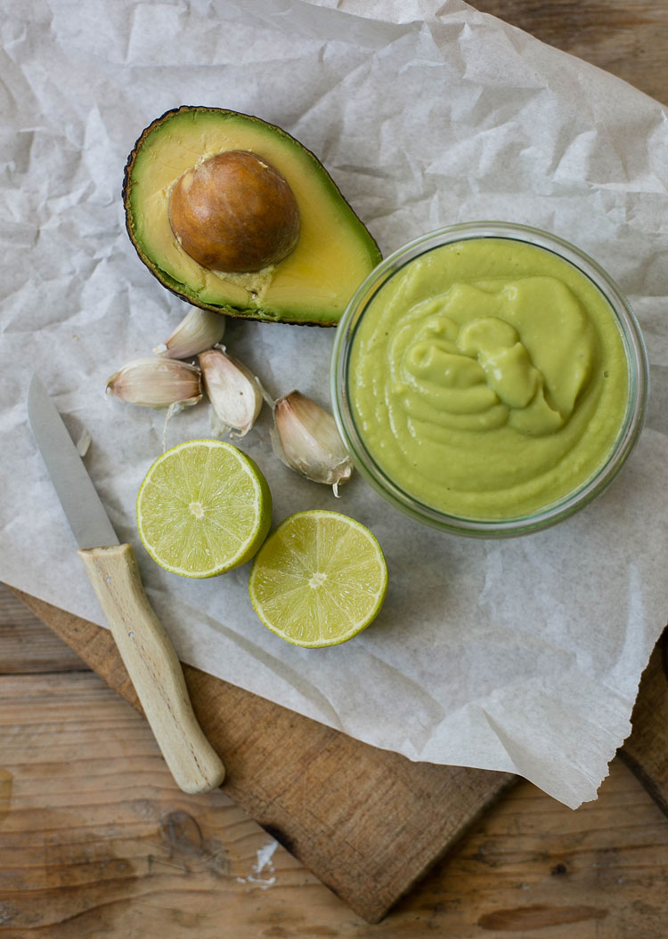 Dazu das Fruchtfleisch einer Avocado mit einer Knoblauchzehe, 230 ml Wasser und dem Saft einer 1/2 Limette im Mixer zu einer sämigen Salsa pürieren und mit Salz abschmecken.