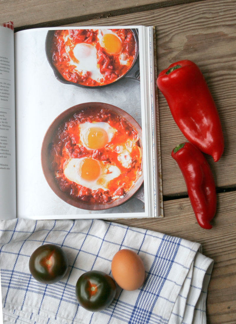 Und weil auch scharf glücklich macht, gab es Shakshuka aus dem aktuellen Lieblingskochbuch dazu. Shakshuka kommt ursprünglich aus Tunesien. Dort isst man es als Frühstück oder kleines Mittagessen. Zum Frühstück kann ich es mir jetzt nicht so vorstellen, aber zusammen mit dem Süßkartoffelgratin war es eine herrliche Mahlzeit ganz ohne Fleisch.