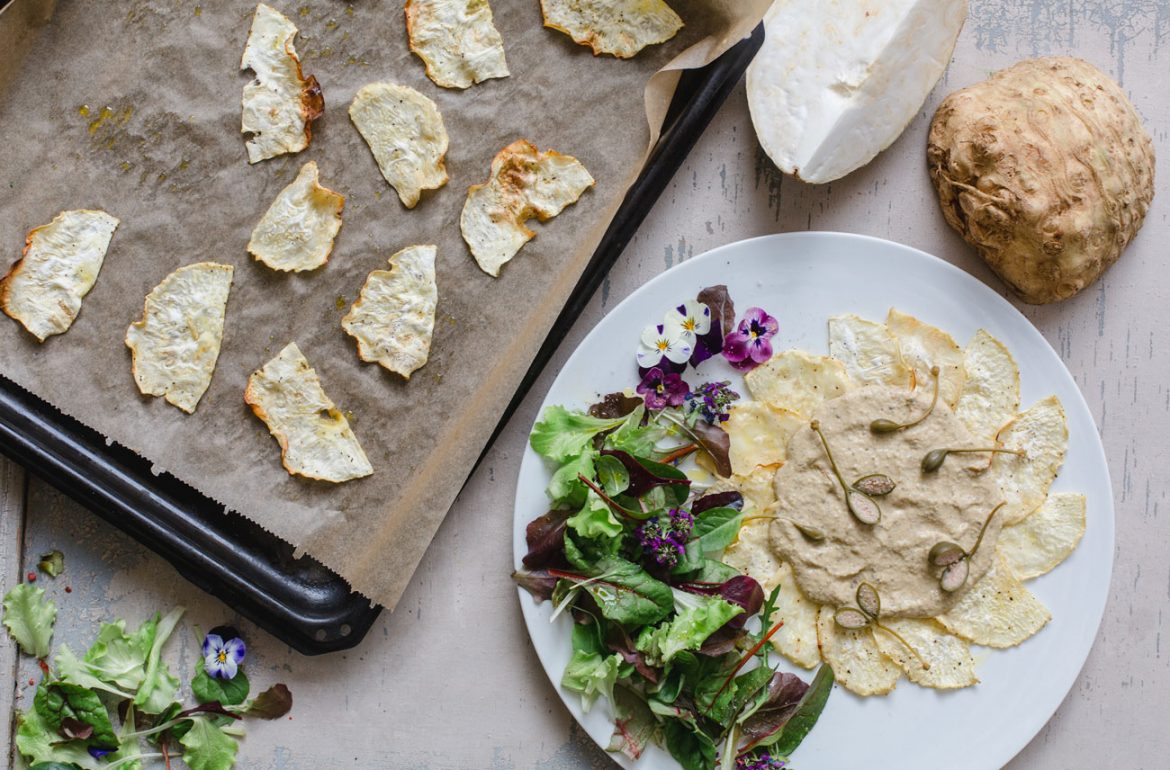 Den Sellerie schälen, halbieren, in 3-5 mm dicke Scheibe schneiden und in einer Schüssel mit dem Rapsöl und dem Salz vermischen. Auf ein mit Backpapier belegtes Blech geben. Im vorgeheiztem Ofen 20-25 Minuten backen. Den Sellerie auskühlen lassen und auf Tellern anrichten.